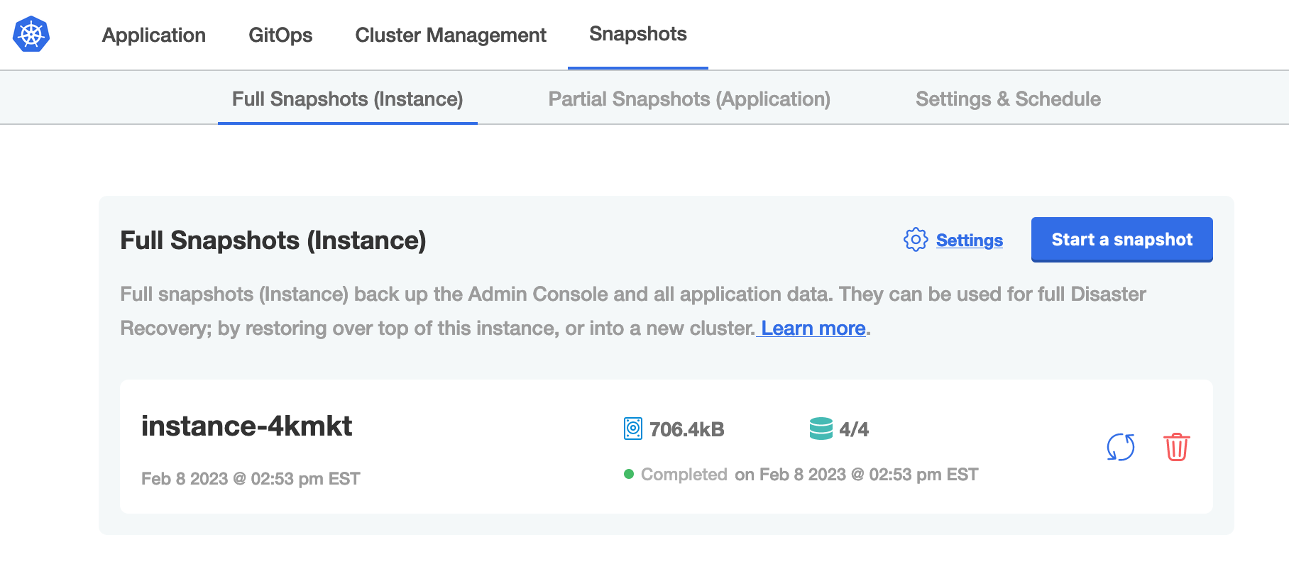 kubectl kots get backupscommand to get the list of full backups for the instance. -
